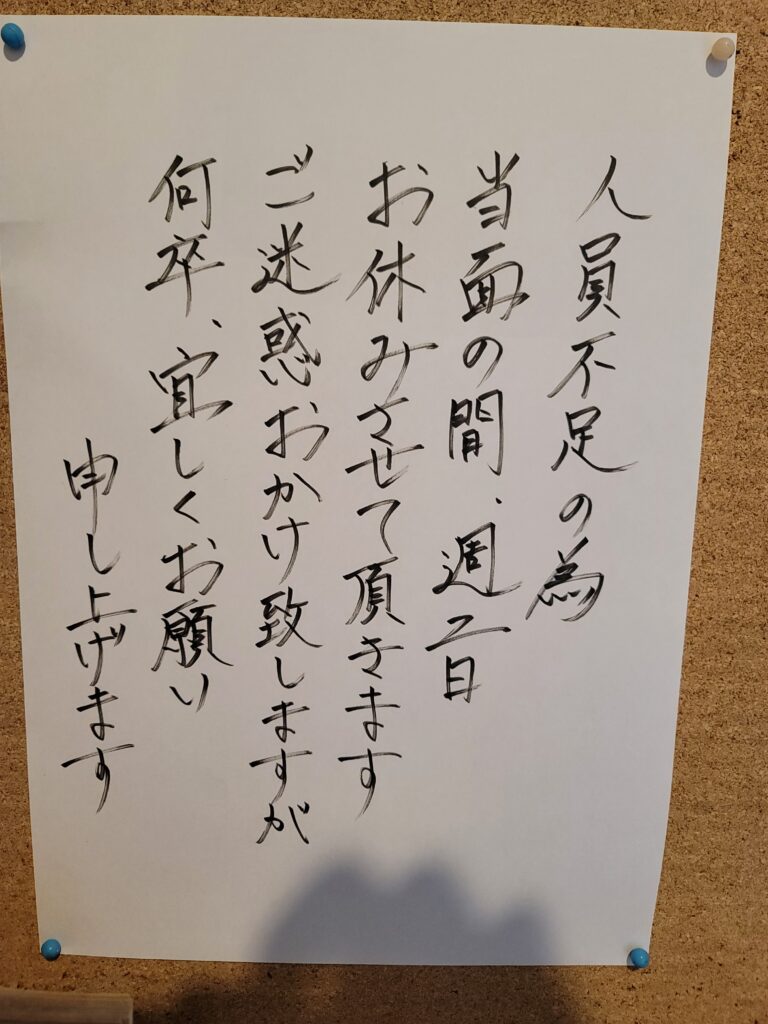 作者: 酒亭 縁投稿日: 2025年3月20日カテゴリー: お知らせ 3月は4日(火)、5日(水)、11日(火)、12日(水)、19日(水)、20日(木)、25日(火)、26日(水)お休みさせていただきます。 尚、人員不足の為、当面の間は週2日間お休みさせていただきます。 何卒、宜しくお願い申し上げます。 弥生のお休み 投稿ナビゲーション 縁の本日のアレコレ‼️縁の本日のアレコレ‼️