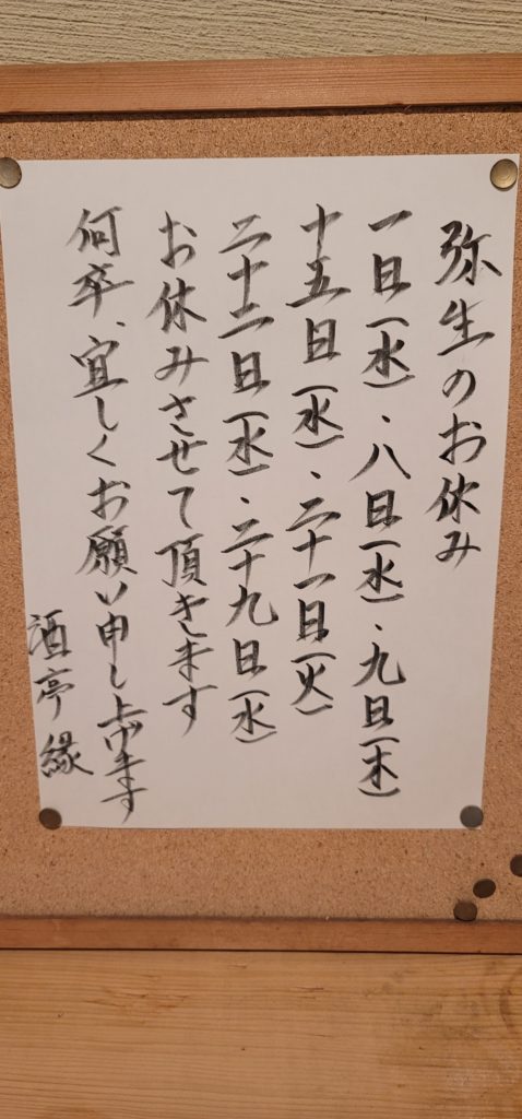 作者: 酒亭 縁投稿日: 2023年3月1日カテゴリー: お知らせ 今月弥生は1日(水)、8日(水)、9(木)、15日(水)、21日(火)、22日(水)、29日(水)お休みさせていただきます。 何卒、宜しくお願い申し上げます。 今月のお休み 投稿ナビゲーション 縁の本日のアレコレ‼️縁の本日のアレコレ‼️