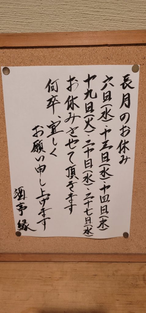 作者: 酒亭 縁投稿日: 2023年9月6日カテゴリー: お知らせ 9月は6日(水)、13日(水)、14日(木)、19日(火)、20日(水)、27日(水)お休みさせていただきます。 何卒、宜しくお願い申し上げます。 長月のお休み‼️ 投稿ナビゲーション 縁の本日のアレコレ‼️縁の本日のアレコレ‼️