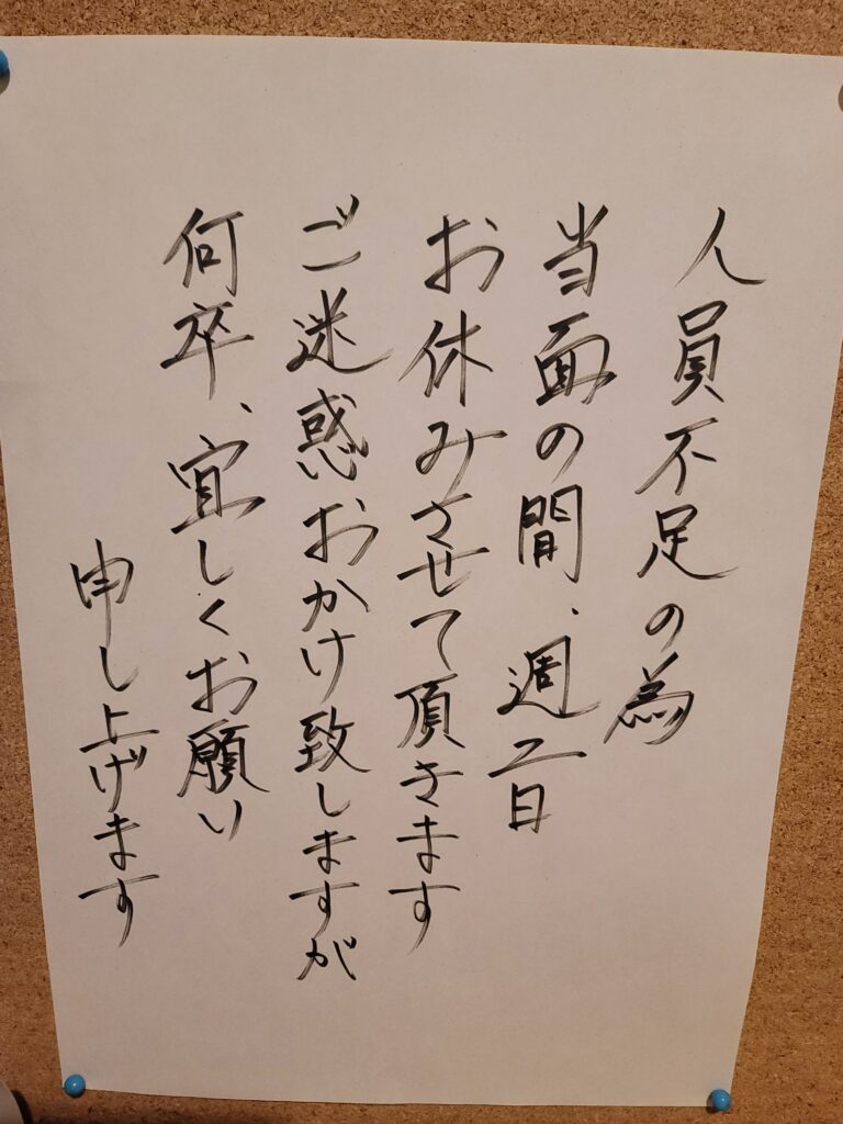 作者: 酒亭 縁投稿日: 2025年11月11日カテゴリー: お知らせ 11月は4日(火)、5日(水)、11日(火)、12日(水)、18日(火)、19日(水)、25日(火)、26日(水)お休みさせていただきます。尚、人員不足の為、当面の間週2日間お休みさせていただきます。何卒、宜しくお願い申し上げます。 霜月のお休み 投稿ナビゲーション 縁の本日のアレコレ‼️縁の本日のアレコレ‼️